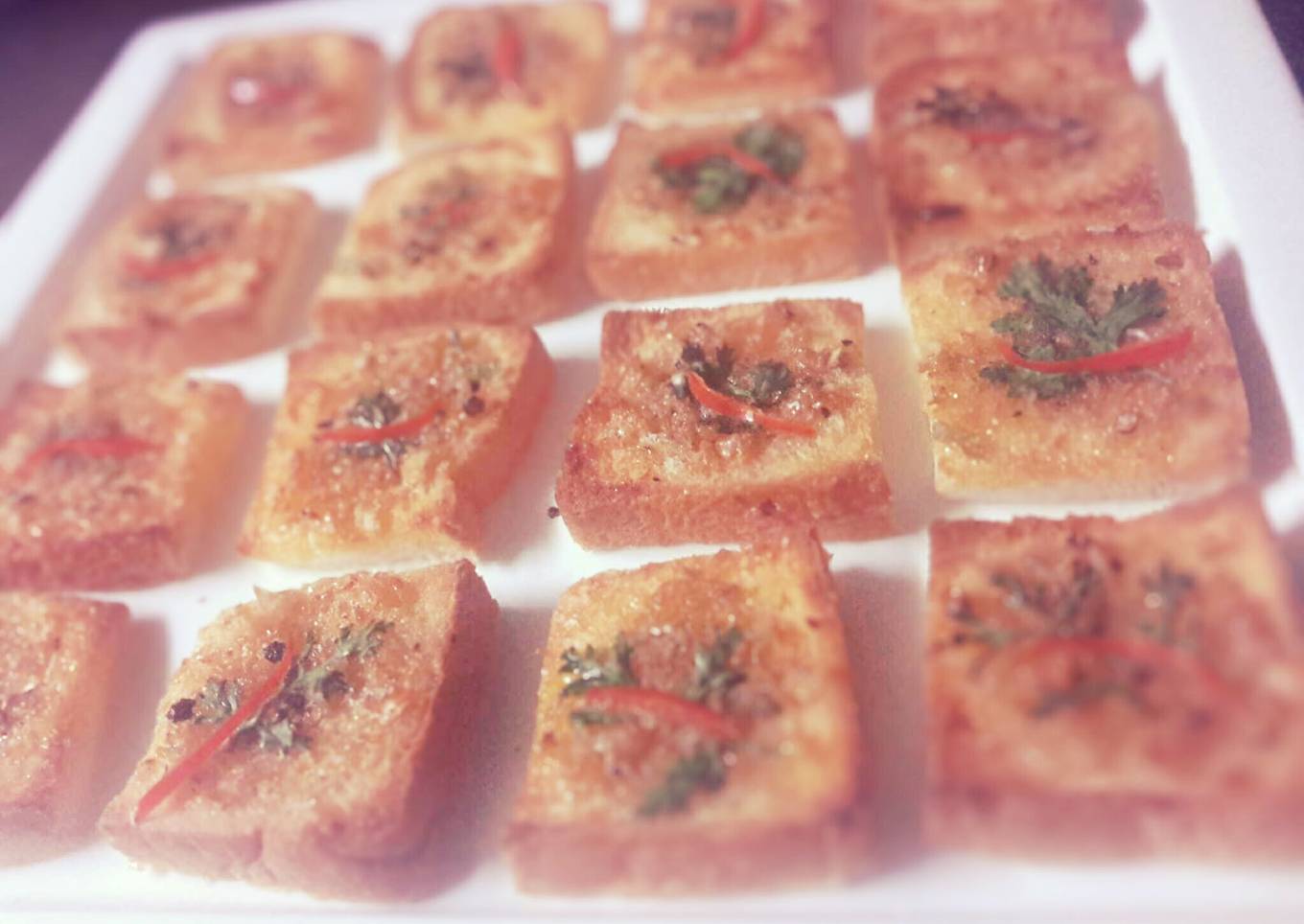 - Top each bread with sugar,decorate with coriander leaves and tiny sliced of red pepper