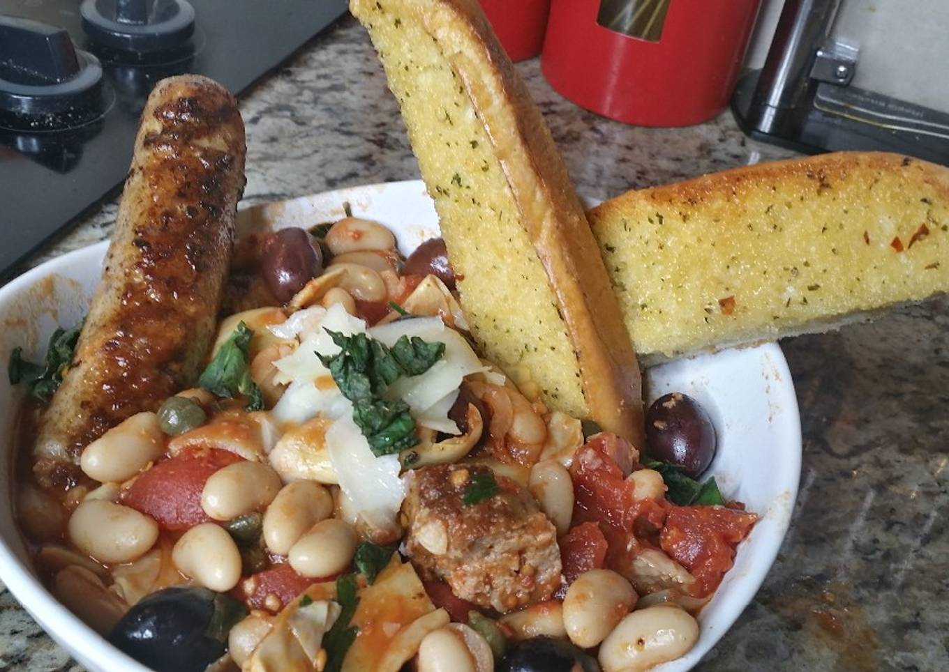 Grilled Sausage and Cannellini Beans Puttanesca w/ Garlic Bread