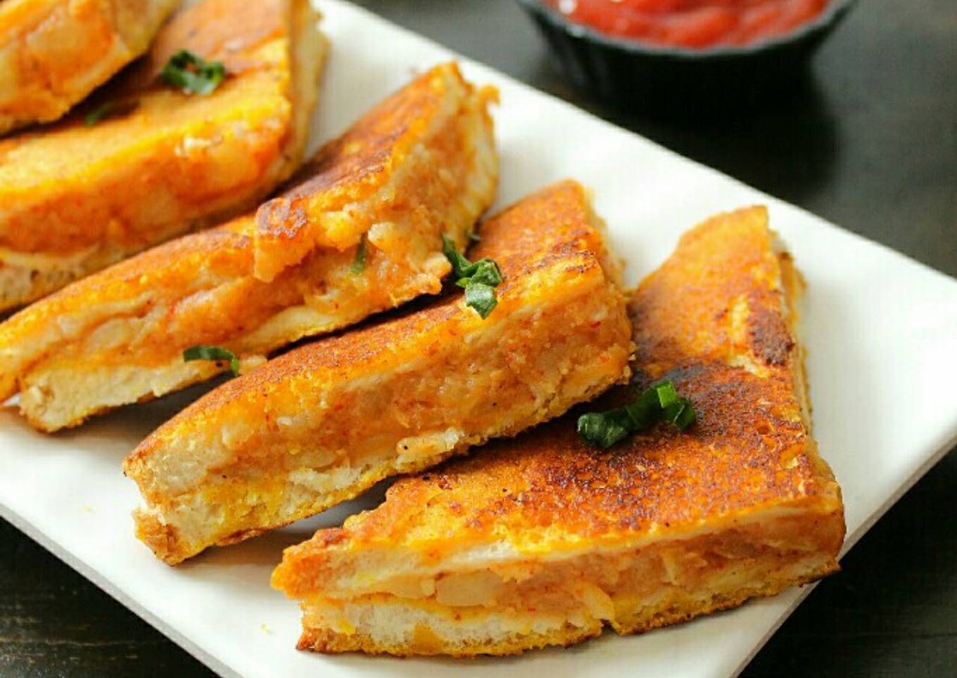 - Heat a non stick griddle / Tava. Sprinkle few drops of Oil on it. Now, the sandwich, which we made with stuffing, dip in chickpeas batter nicely. make sure it cover all sides. Handle with soft hands.