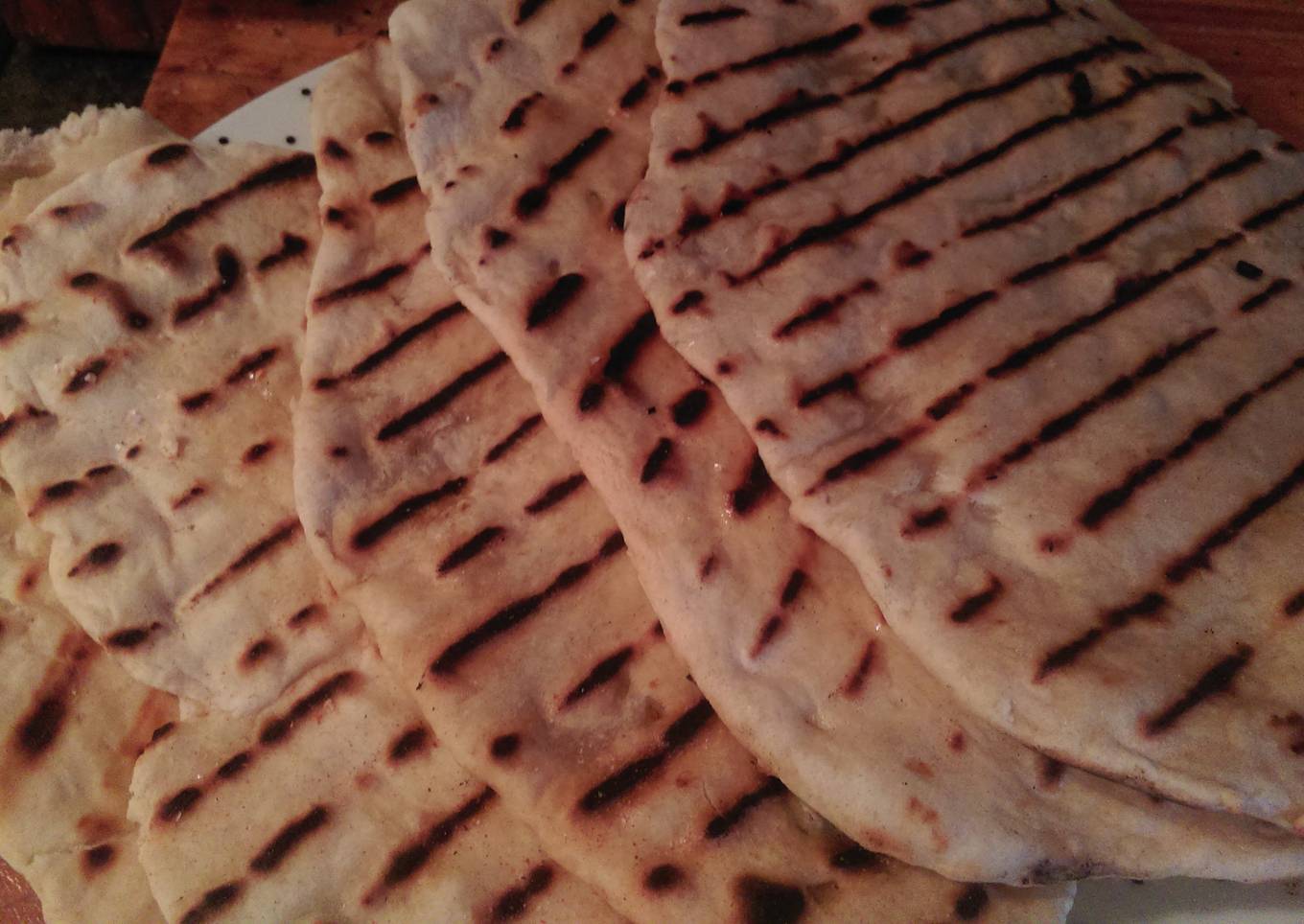 - Heat cast iron griddle pan on one side of naan sprinkle with a little water and cook water side down until dough bubbles and gets a golden colour, turn over and finish cooking on opposite sides.