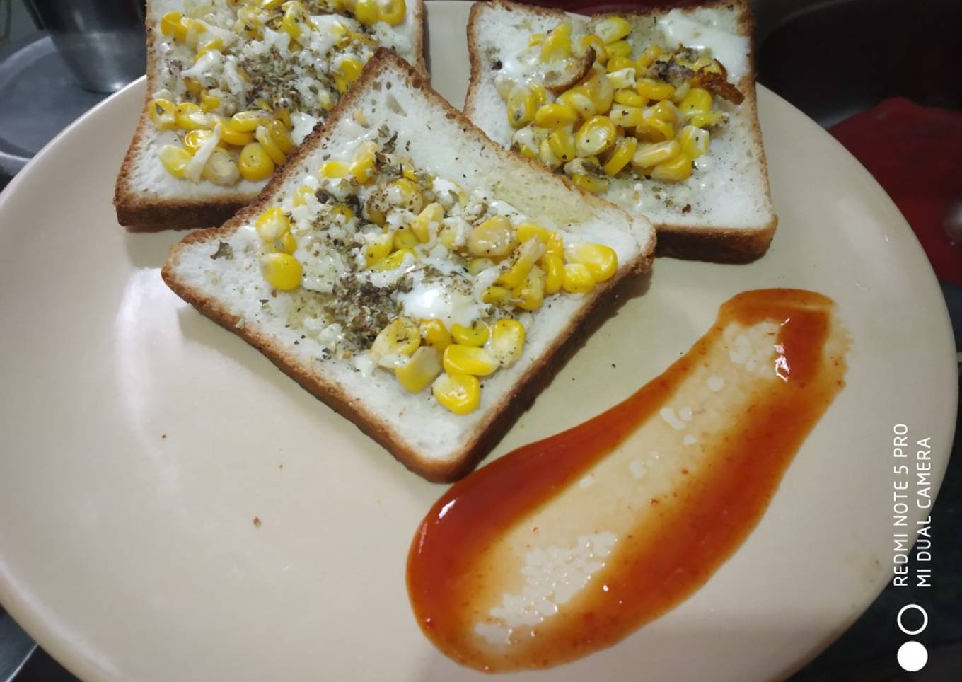 - Take a slices butter spread add sweetcorn garnish salt and pepper.