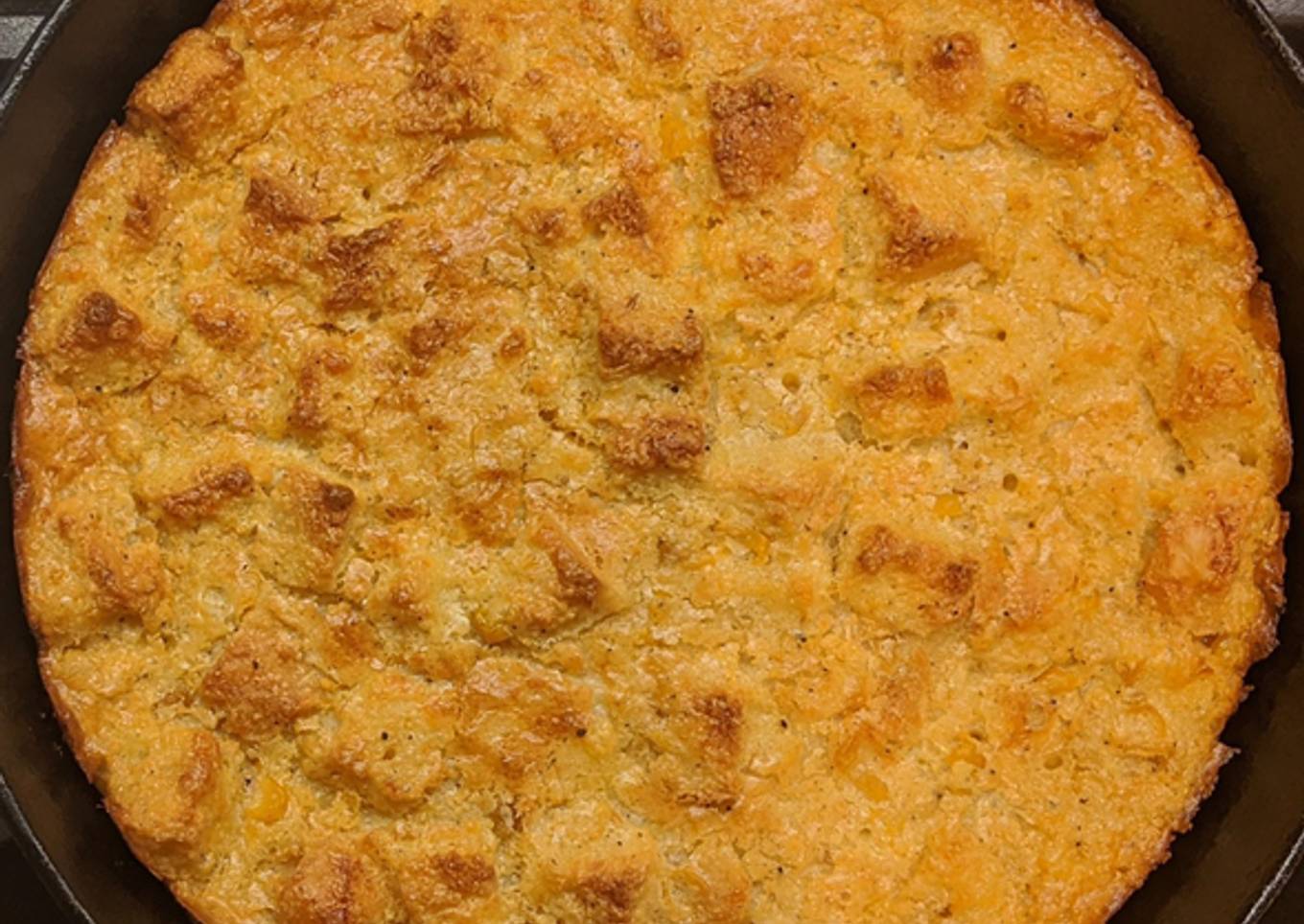 - Combine corn, cream, eggs, baking powder, cornmeal, parmesan, salt, and pepper in a large mixing bowl. Add cubed bread and fold to combine. Pour batter into skillet, right on top of the onion mixture. Bake 50 minutes, or until set. Cool slightly before serving.