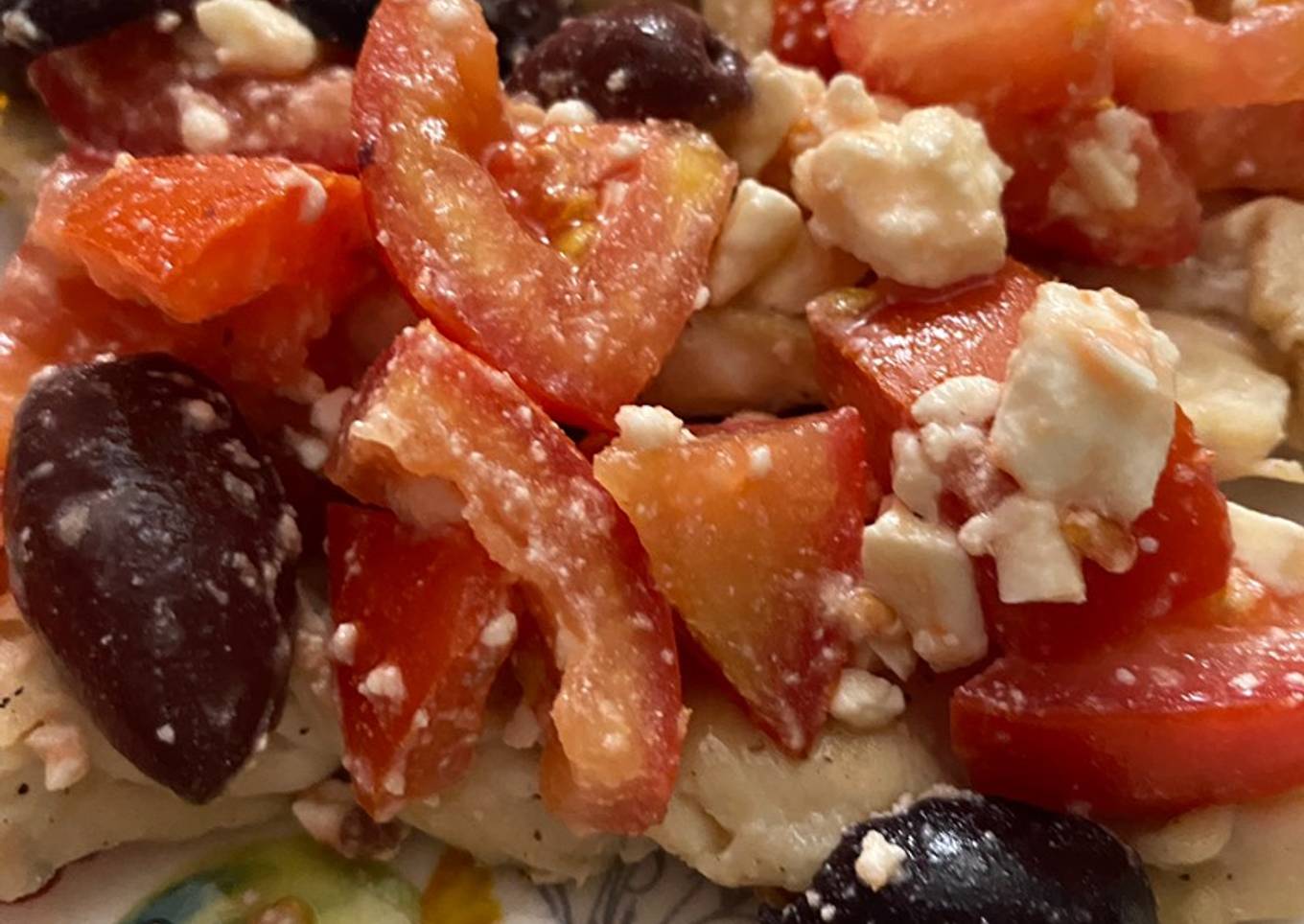 - Lets start with the greek topping for the chicken first. Wash tomatoes and cut in half add to a bowl, next cut the greek olives in half add to the tomatoes, then add some Crumble feta cheese, add diced red onion if using it. Mix, then set aside, dont place in the refrigerator tomatoes dont like the refrigerator. (you can add a splash of baslsamic if you like) this is now done and is the topping for the grilled chicken