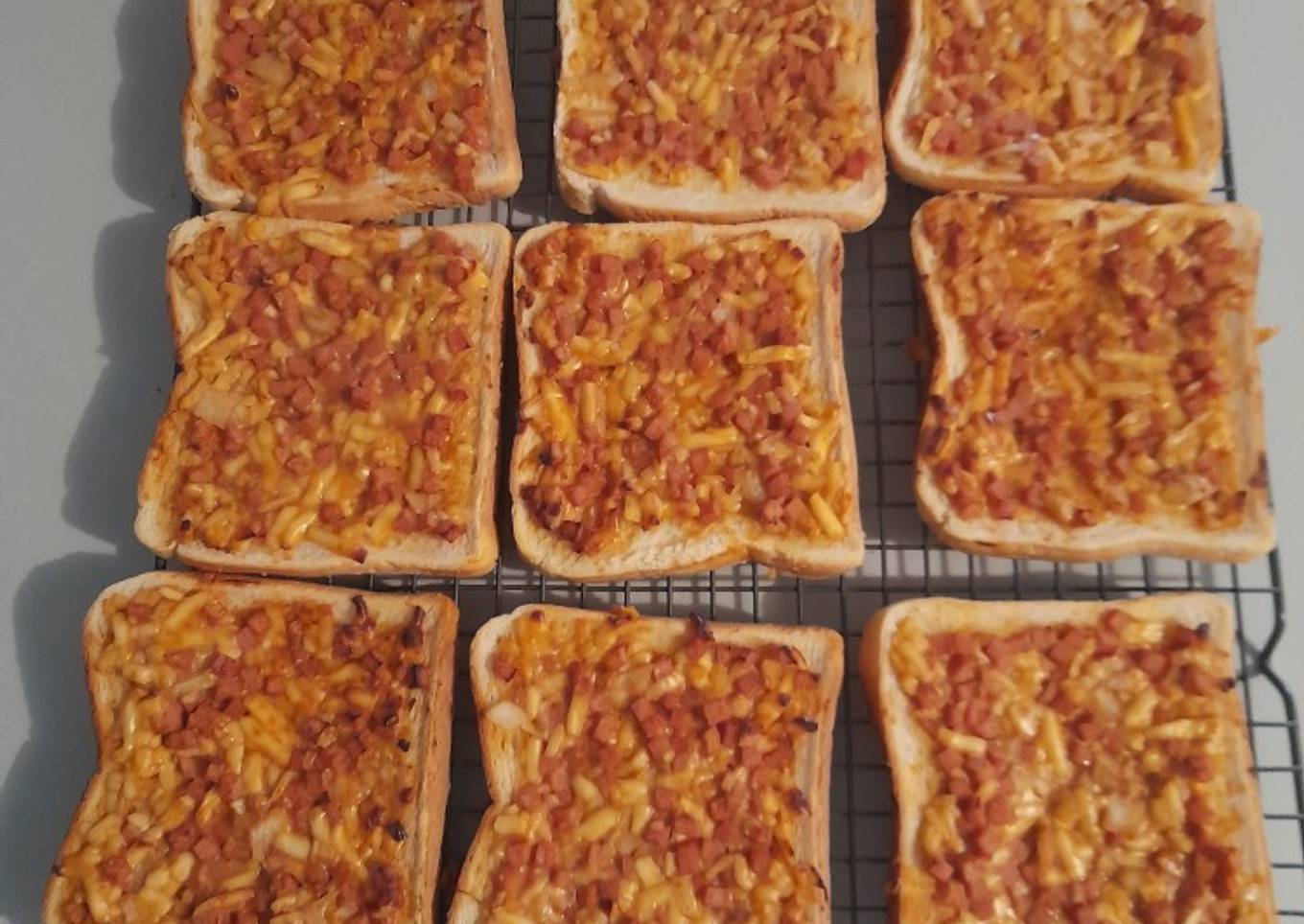 - Add a dessert spoon of mixture to the pieces of bread and spread it out