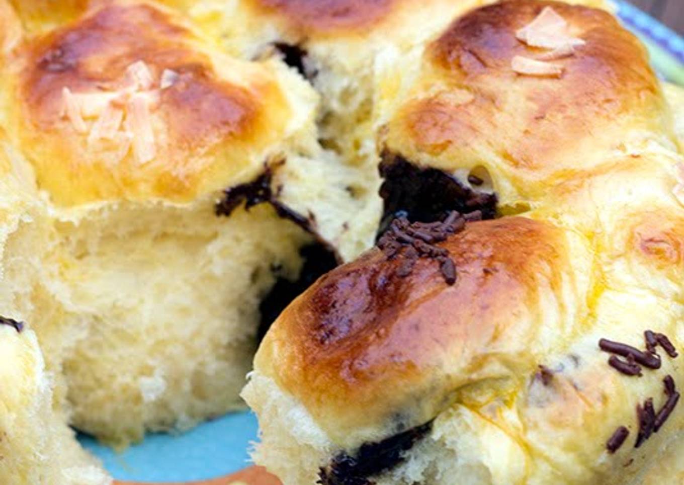 - Whisk the topping ingredient: egg, salt and water in a small bowl. Brush egg wash on the surface of the bun and spread chocolate jimmies or grated cheese. Bake in a preheated oven 180°F Celsius for 15 minutes or until the surface golden brown. Transfer into wire rack and let cool completely.